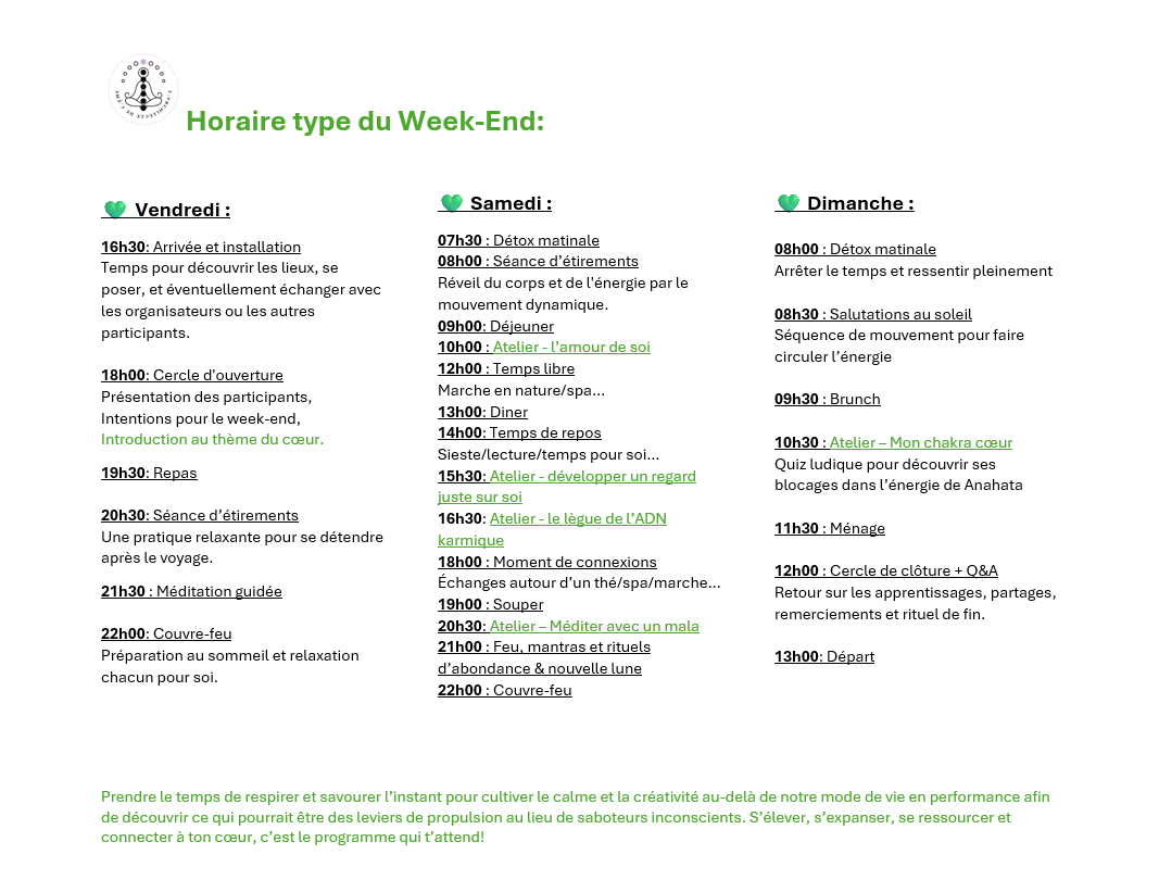 Routine matinale, 5 repas, nombreux ateliers, spa, feux, méditation, nature, ...